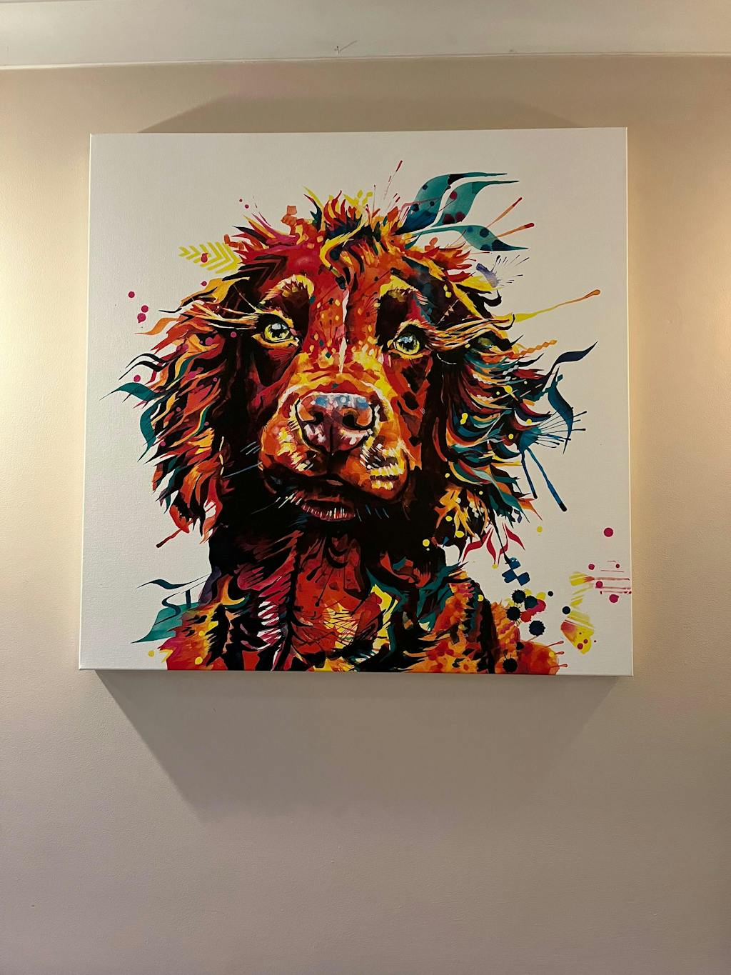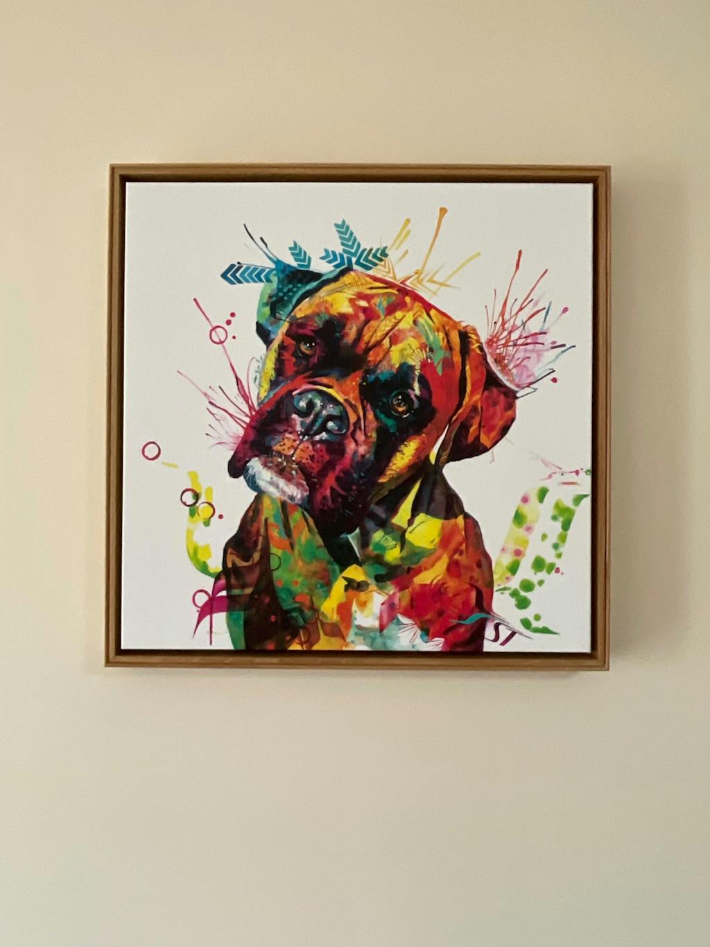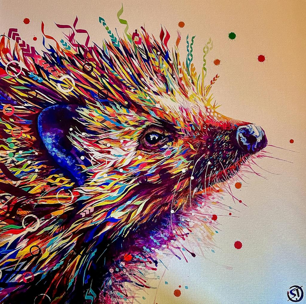 Sarah has been painting animals in this style for nearly a decade, perfecting her unique painting method, a wonderous mix of hand painted geometric pattern and fluid paint splashes. She has a talent for making animals come alive, like they’re waiting to jump off the wall and have a cuddle. Easy to fall in love with them, because they feel like your best friend.