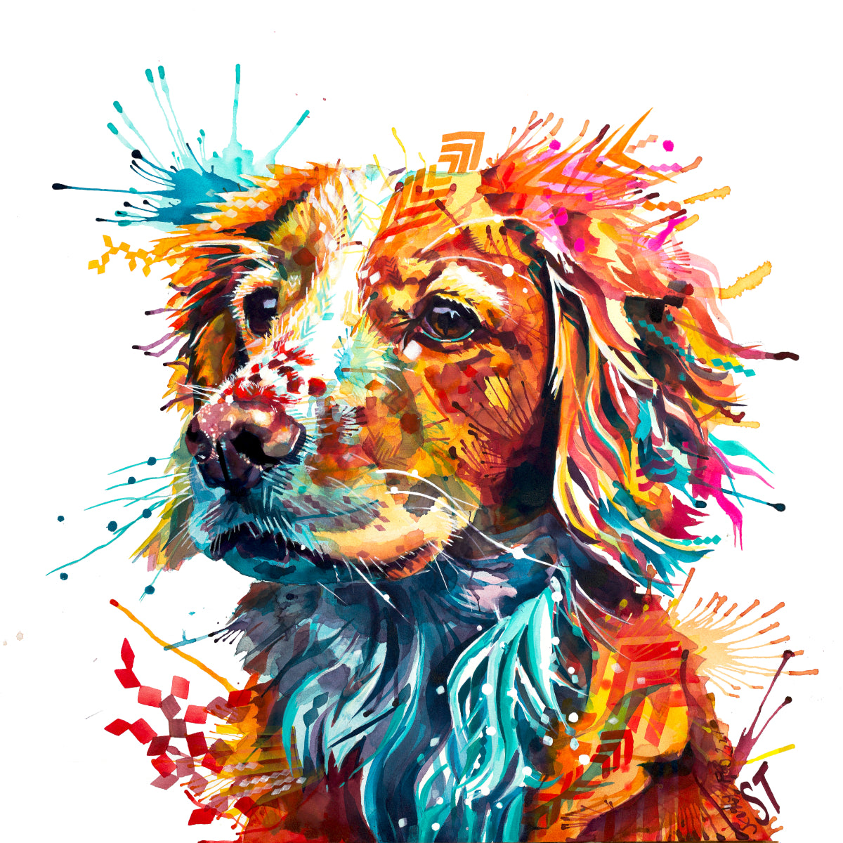 Sarah has been painting animals in this style for nearly a decade, perfecting her unique painting method, a wonderous mix of hand painted geometric pattern and fluid paint splashes. She has a talent for making animals come alive, like they’re waiting to jump off the wall and have a cuddle. Easy to fall in love with them, because they feel like your best friend.