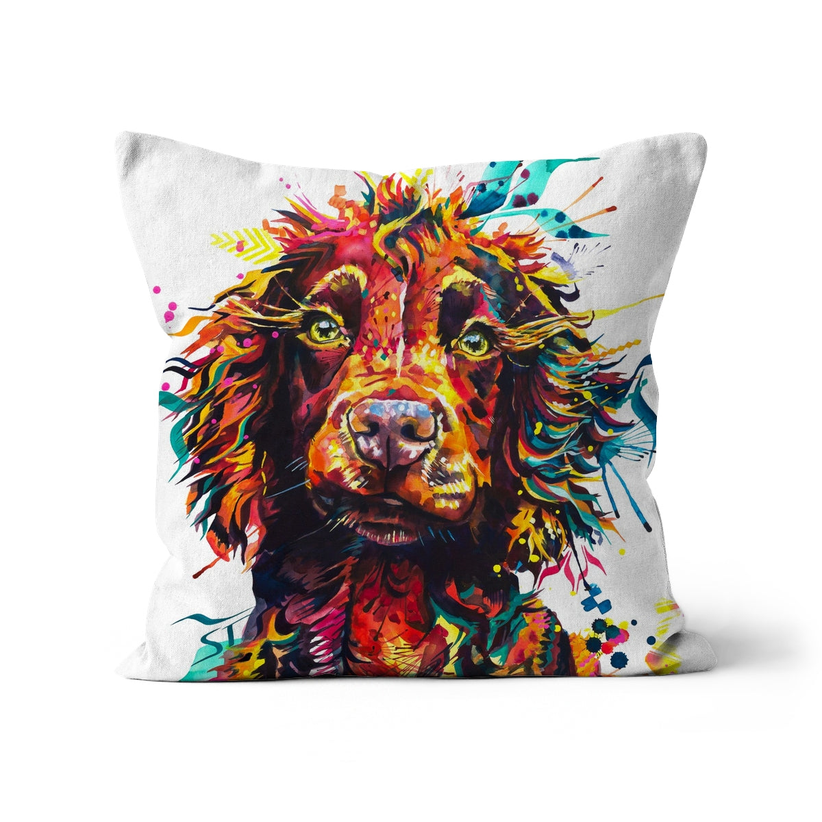 Cockapoo, black labrador, highland cow cushions and print of a cocker spaniel.